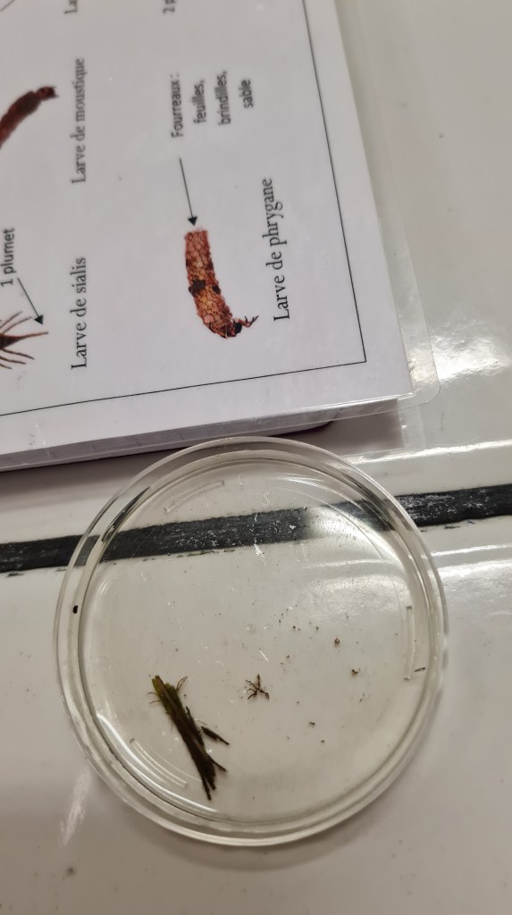 Suite à une décantation, 3 types de granulométrie ont été observés: des graviers, des limons, des particules en suspension. La mesure du pH quant à elle, nous a révélé que l’eau de la rivière était actuellement légèrement acide (pH=6).